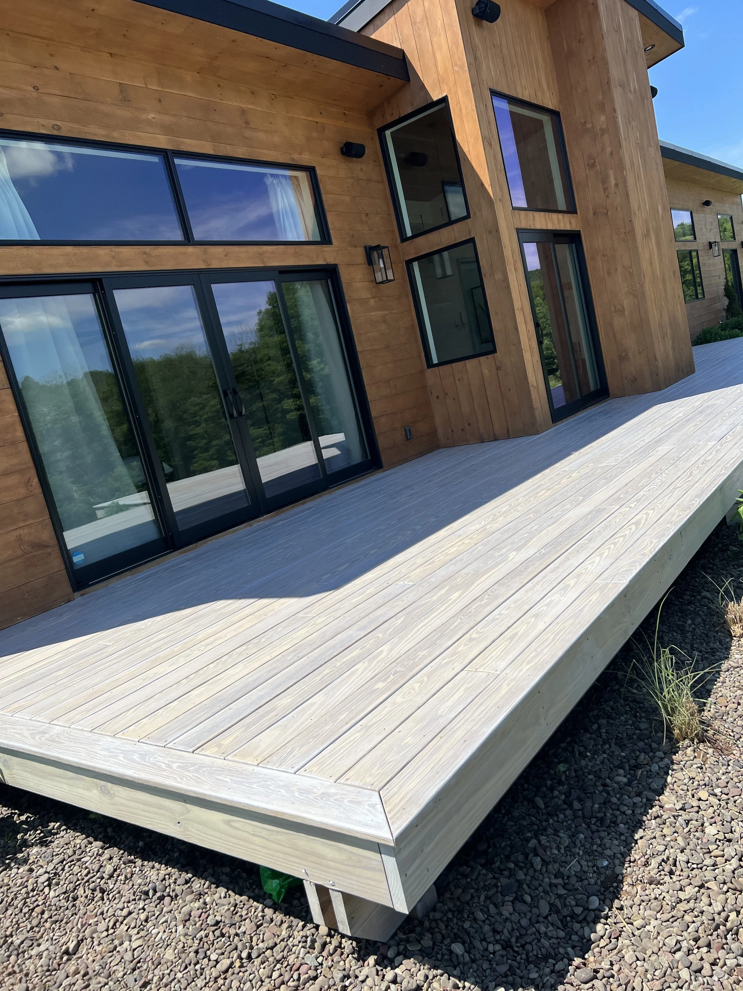 Wooden deck outside a modern house with large glass sliding doors and multiple windows, under a bright blue sky.